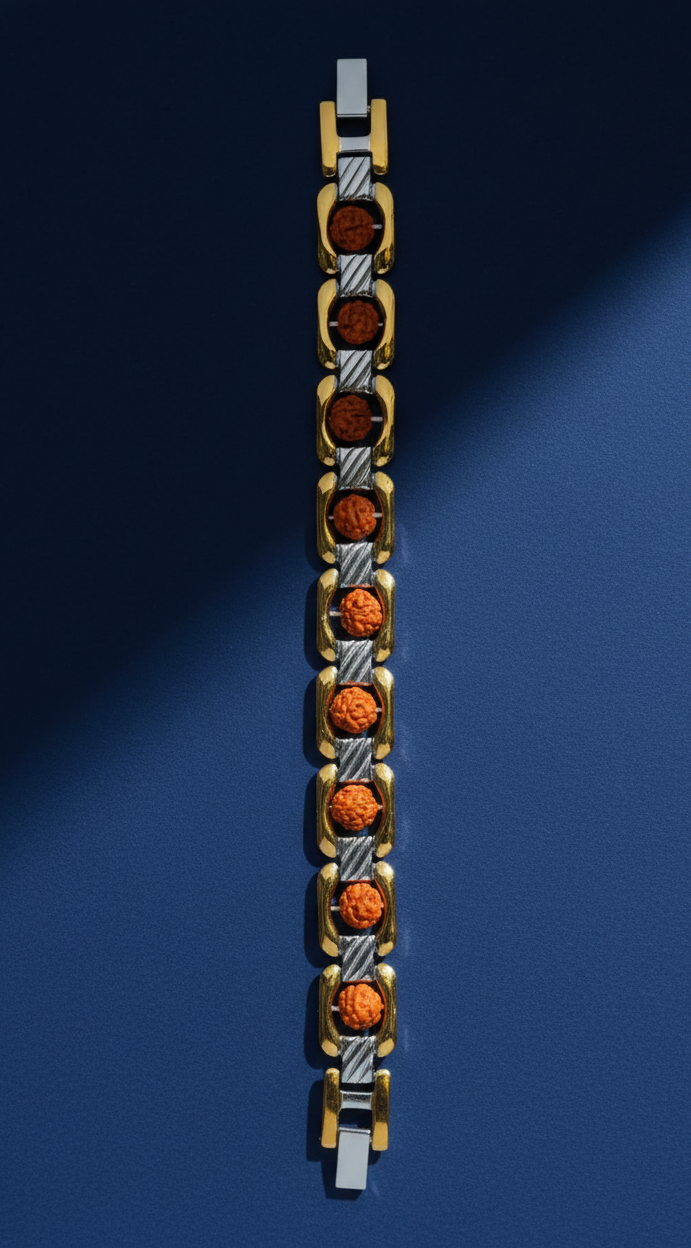 Experience a perfect blend of spirituality and luxury with this elegant Rudraksha gold link bracelet. Crafted with premium gold-finished links and authentic Rudraksha beads, it offers both divine significance and modern style. The bracelet is designed for comfortable daily wear while adding a refined touch to traditional and contemporary outfits. Ideal for those who value spiritual energy, protection, and timeless elegance, this bracelet makes a meaningful accessory or a thoughtful gift for special occasions.
