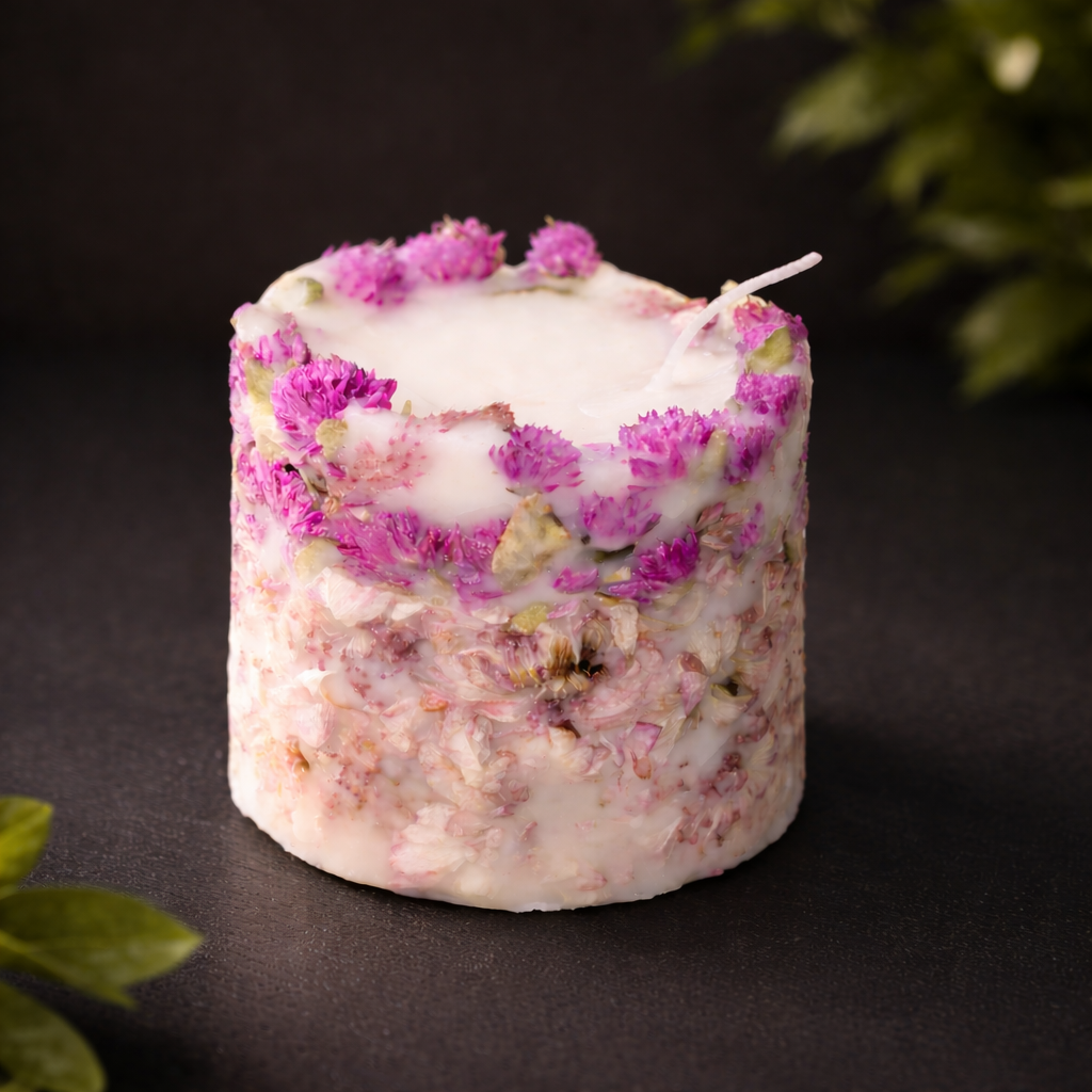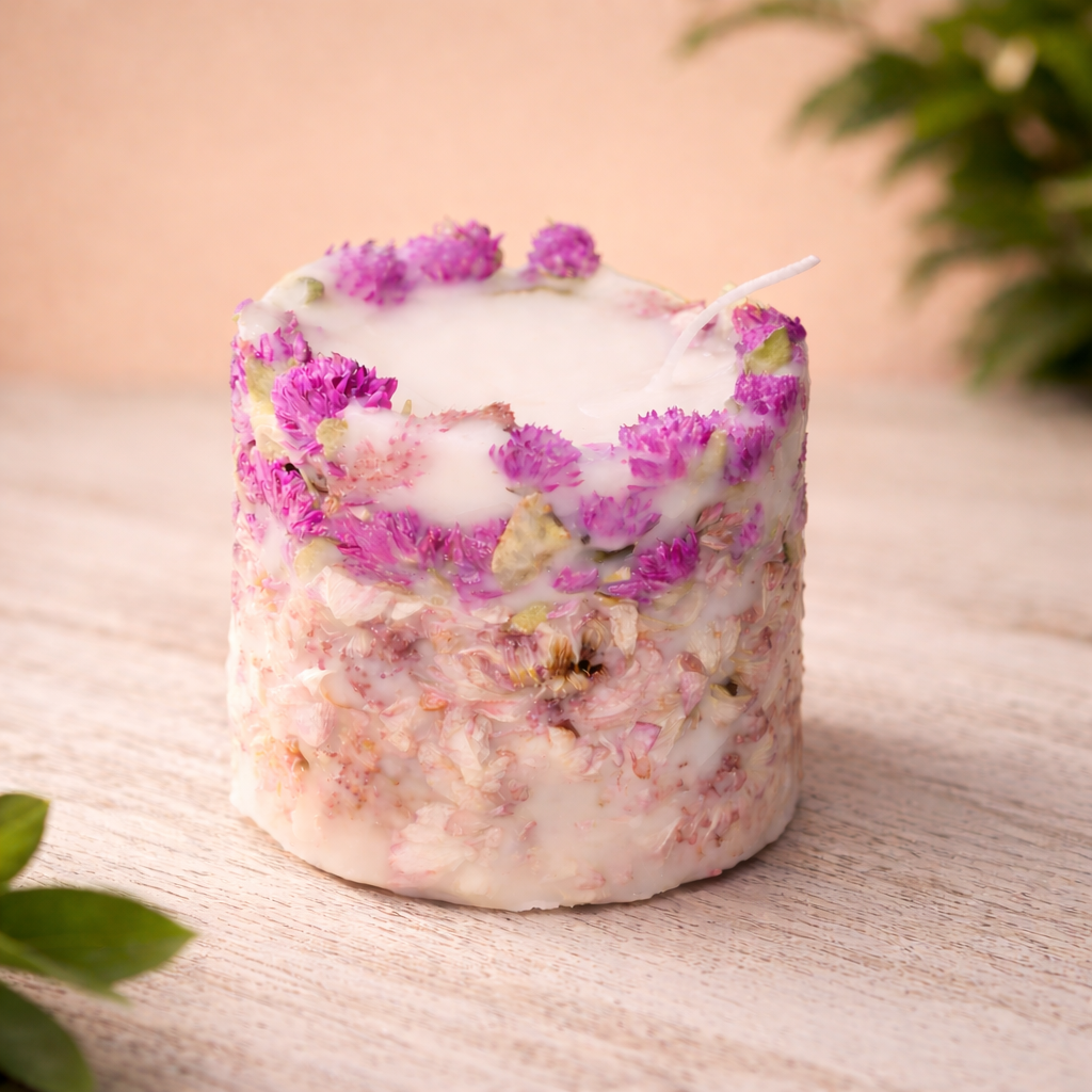Blush Bloom is a premium handcrafted scented candle infused with delicate dried florals, designed to bring warmth, elegance, and calm into your space. Made with high-quality wax and natural botanical elements, this candle creates a soft, soothing glow while gently releasing a floral fragrance that relaxes the senses. Its artisanal design and luxurious finish make it perfect for home décor, gifting, meditation, or unwinding after a long day. A beautiful blend of fragrance and craftsmanship, Blush Bloom transforms everyday moments into serene experiences.