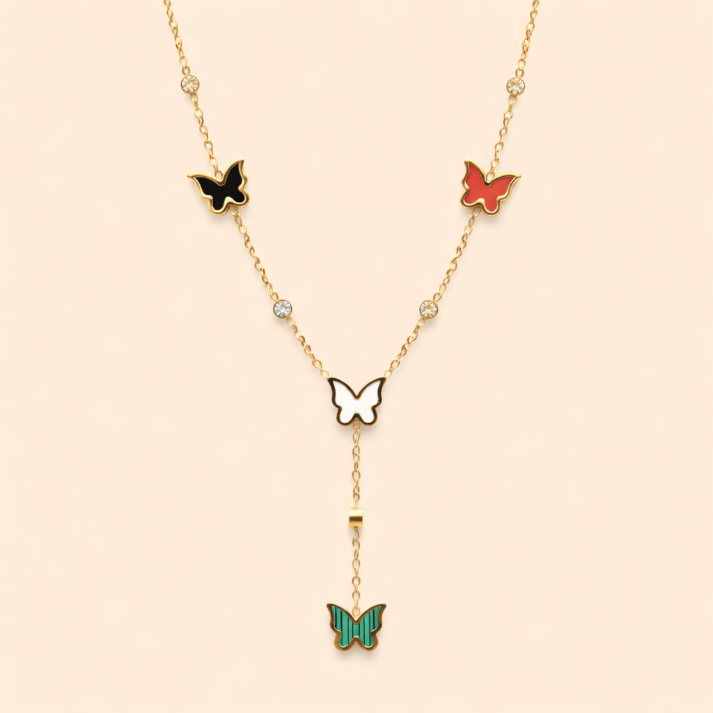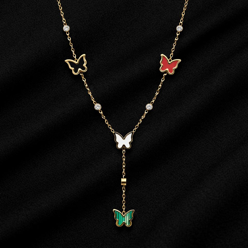 The Butterfly Cascade Charm Necklace is a graceful expression of color, movement, and elegance. Crafted with a delicate gold-toned chain, it features vibrant butterfly motifs in black, red, white, and green enamel, accented with subtle sparkling stones. The Y-drop design adds a modern, flattering silhouette that elongates the neckline beautifully. Perfect for day-to-evening wear, this necklace brings a playful yet luxurious touch to western outfits, festive looks, and contemporary styling.