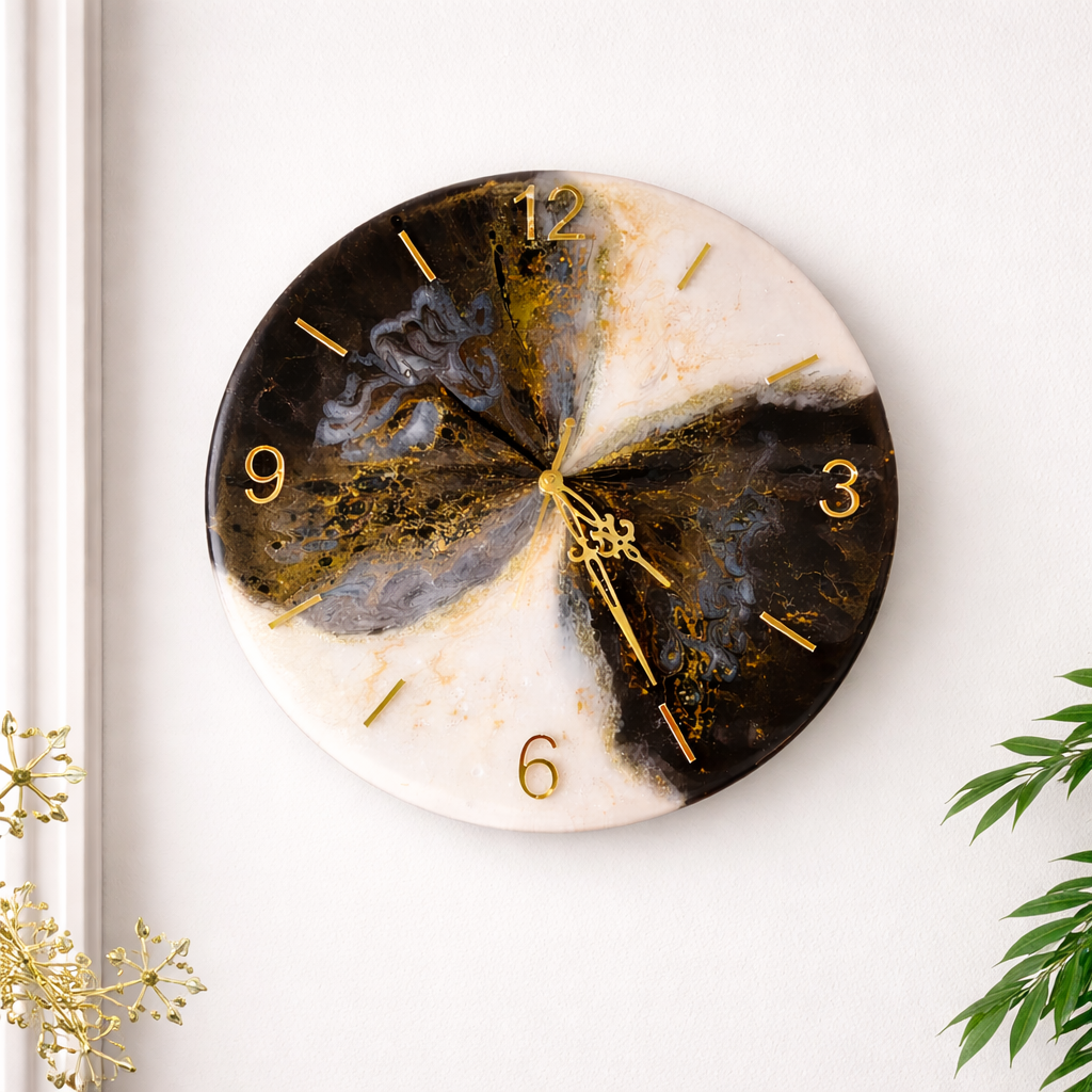 • Material: High-quality epoxy resin, premium pigments, metallic gold flakes, durable MDF wooden base, silent quartz clock mechanism, acrylic protective coating, and sturdy wall-mount hardware.