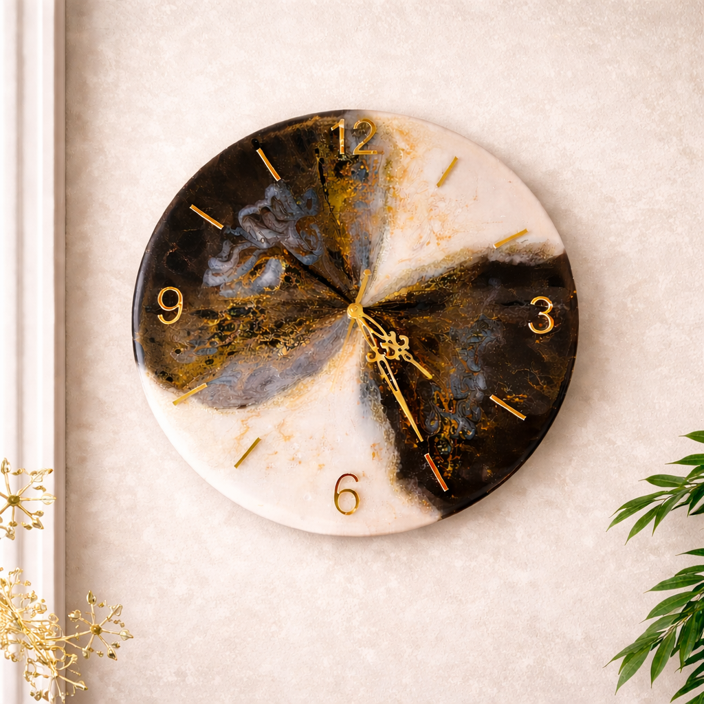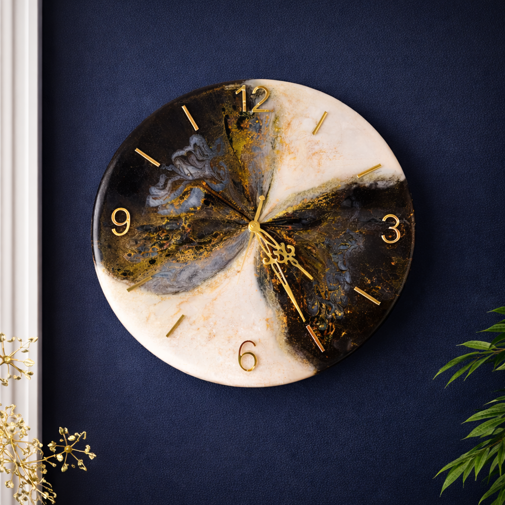 This handmade resin art clock is a perfect blend of luxury and creativity. Designed with rich black, ivory, and gold tones, each swirl is uniquely crafted, making every piece truly one of a kind. The elegant gold accents and premium finish add a sophisticated touch to any space. Carefully handcrafted with attention to detail, this artistic timepiece is more than just a clock—it’s a statement décor piece that enhances your living room, office, or bedroom with timeless elegance and modern charm.