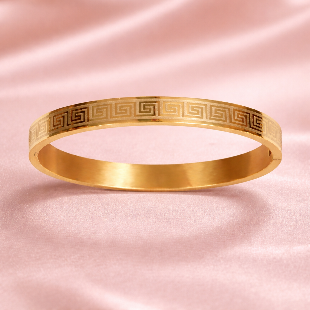 This elegant Greek Key Gold Bracelet is a perfect blend of timeless design and modern luxury. Crafted with a sleek gold-tone finish, it features a finely detailed Greek key pattern symbolizing infinity and strength. The smooth inner surface ensures comfortable all-day wear, while the polished exterior adds a refined, premium look. Ideal for both casual and formal occasions, this bracelet makes a sophisticated style statement and a thoughtful gift for those who appreciate classic design with a contemporary touch.