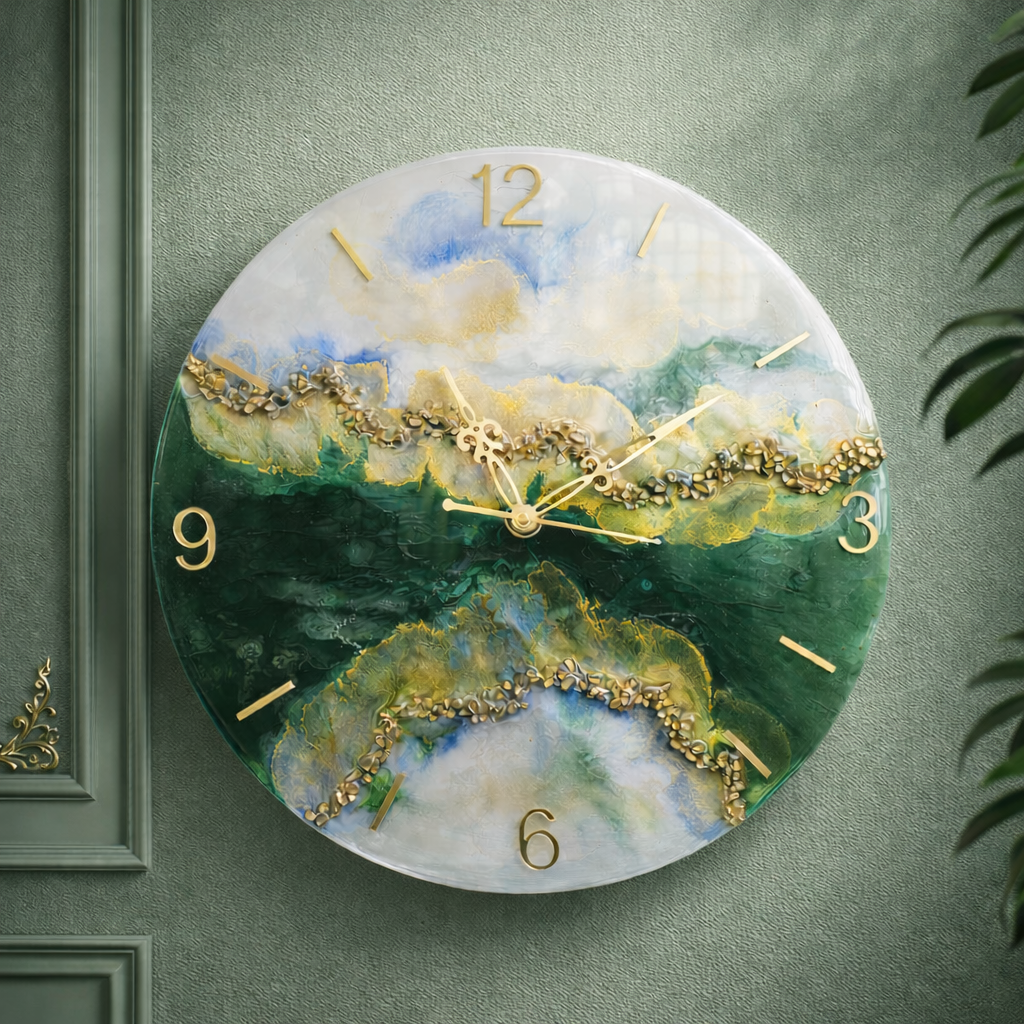 Add elegance and sophistication to your space with the Emerald Horizon Luxury Resin Wall Clock. Designed with stunning abstract swirls of emerald green, soft white, and subtle blue tones, this artistic timepiece is beautifully accented with rich gold detailing for a premium finish. The bold gold Arabic numerals at 12, 3, 6, and 9, along with sleek hour markers and ornate golden hands, enhance its luxurious appeal. Crafted with high-quality resin and a glossy finish, this clock is not just a timekeeper but a statement décor piece. Perfect for living rooms, bedrooms, offices, or luxury interiors, it adds a modern and elegant touch to any wall.
