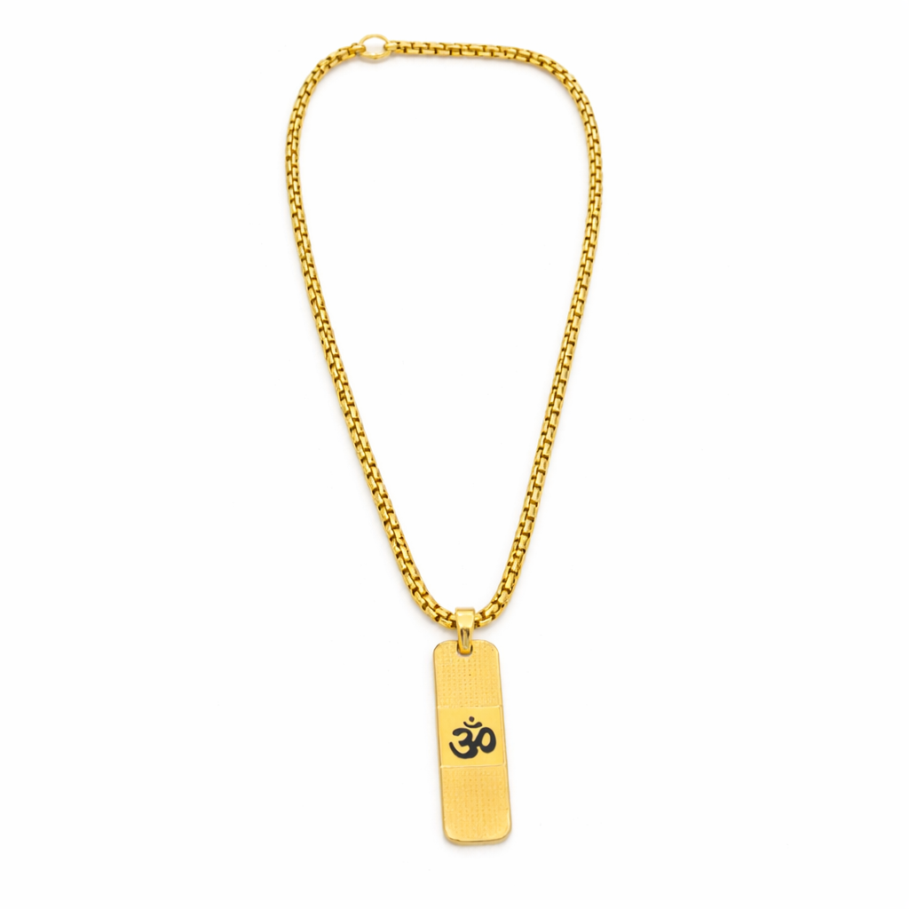This **Om Aura Gold Pendant Chain** is crafted for those who value spirituality with timeless style. Featuring a sleek gold-finished chain paired with an elegant rectangular pendant engraved with the sacred **Om** symbol, it represents peace, strength, and positive energy. Perfect for daily wear or special occasions, this chain blends traditional meaning with a modern look. A thoughtful gift for loved ones, it complements both ethnic and contemporary outfits while adding a touch of divine elegance to your jewelry collection.