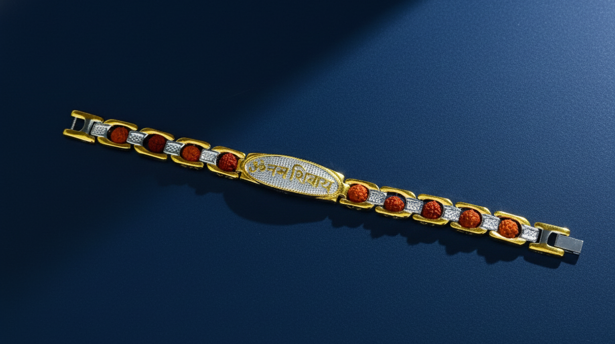 This sacred Om Namah Shivaya Rudraksha gold bracelet combines spiritual devotion with premium craftsmanship. Featuring authentic Rudraksha beads set in a polished gold and silver-tone link design, the engraved centerpiece adds a powerful spiritual touch. Designed for comfort and durability, it is ideal for daily wear or religious occasions. This bracelet symbolizes peace, protection, and positive energy, making it a meaningful accessory for devotees and a thoughtful gift for those seeking spiritual balance and elegance.