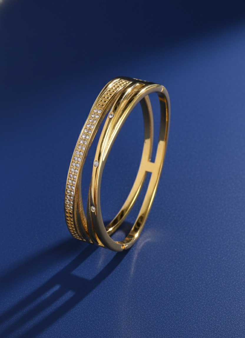 The Regal Curve Diamond Bracelet features a sleek, contemporary gold design with smooth curved layers highlighted by delicate stone accents. Crafted for elegance and comfort, this bracelet offers a perfect balance of modern sophistication and timeless charm. Its polished finish and refined detailing make it suitable for daily wear as well as special occasions. Easy to style with both ethnic and western outfits, this bracelet is an excellent gifting choice and a luxurious addition to any jewelry collection.