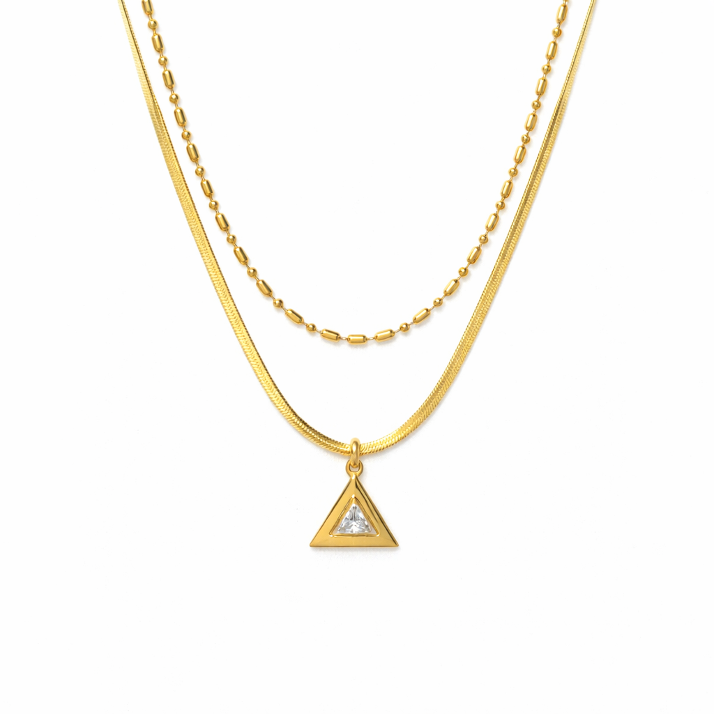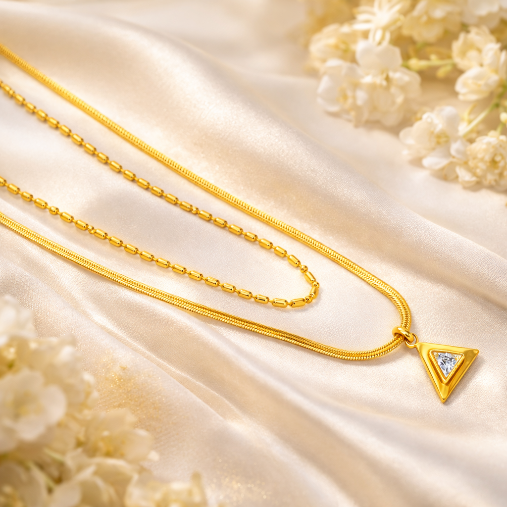 Make a bold yet elegant statement with the Trinity Glow Layered Gold Necklace. This stylish piece features a refined double-layer chain design paired with a sleek triangular pendant that holds a sparkling crystal at its center. The contrast of smooth and textured chains adds depth and modern charm, while the geometric pendant symbolizes balance and strength. Perfect for everyday wear or special occasions, this necklace effortlessly enhances both casual and dressy outfits.