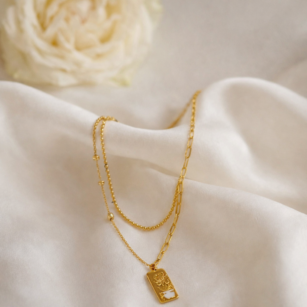 Make a graceful style statement with the Golden Bloom Layered Charm Necklace. This elegant piece features a beautifully layered gold-tone chain design, combining fine links and bead accents for a rich, textured look. The rectangular charm pendant is delicately engraved with a floral motif, symbolizing beauty and positivity. Perfect for layering lovers, this necklace adds depth and sophistication to both casual and festive outfits. A versatile accessory that blends modern fashion with timeless charm.