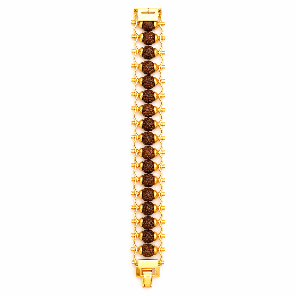 Experience a perfect blend of spirituality and luxury with this elegant Rudraksha gold link bracelet. Crafted with premium gold-finished links and authentic Rudraksha beads, it offers both divine significance and modern style. The bracelet is designed for comfortable daily wear while adding a refined touch to traditional and contemporary outfits. Ideal for those who value spiritual energy, protection, and timeless elegance, this bracelet makes a meaningful accessory or a thoughtful gift for special occasions.