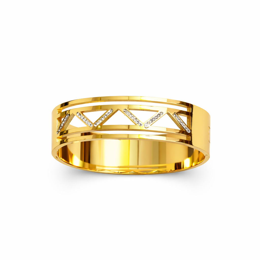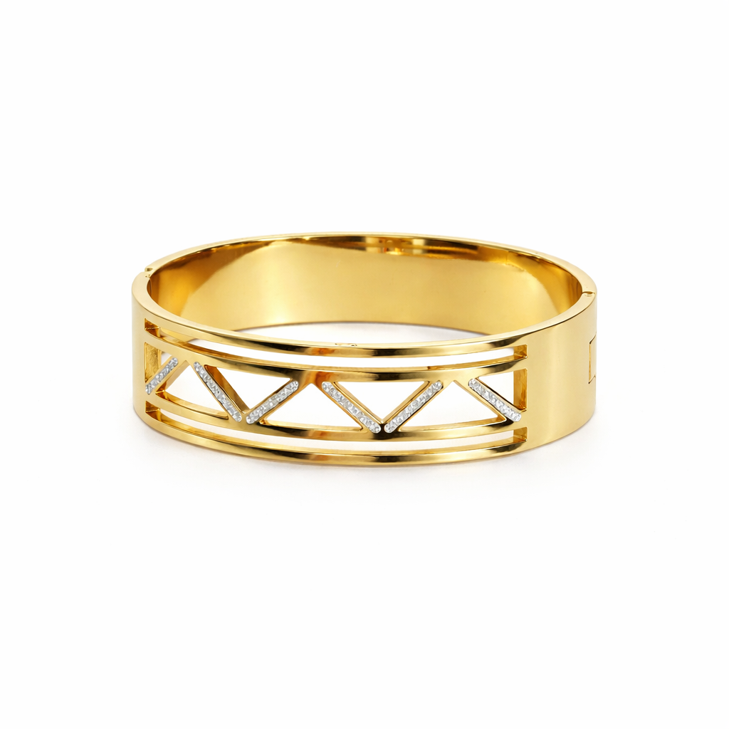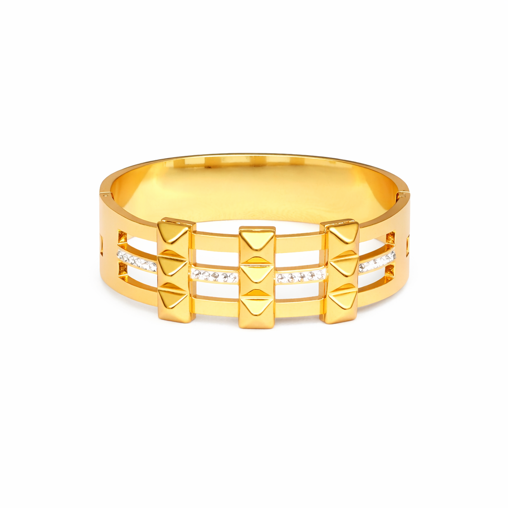 Elevate your style with this sophisticated gold bracelet featuring a sleek geometric cutwork design accented with subtle stone detailing. The clean lines and high-polish finish create a modern yet timeless look that adds refined elegance to any outfit. Crafted for durability and comfortable wear, this bracelet is perfect for daily styling as well as festive and special occasions. Its contemporary design pairs effortlessly with both ethnic and western ensembles, making it a versatile addition to your jewelry collection and a thoughtful gift choice.