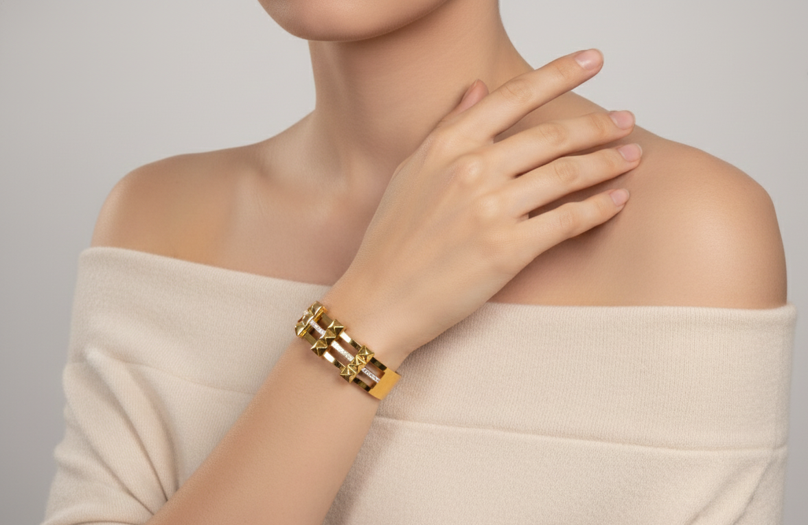 Make a bold style statement with this premium gold bracelet featuring a striking geometric design and subtle stone accents. The structured pattern and polished finish give it a powerful yet elegant appeal, perfect for modern fashion lovers. Crafted for durability and comfortable wear, this bracelet is ideal for everyday elegance as well as festive and special occasions. Its contemporary design pairs effortlessly with both ethnic and western outfits, making it a versatile addition to any jewelry collection and a thoughtful gift for special moments.