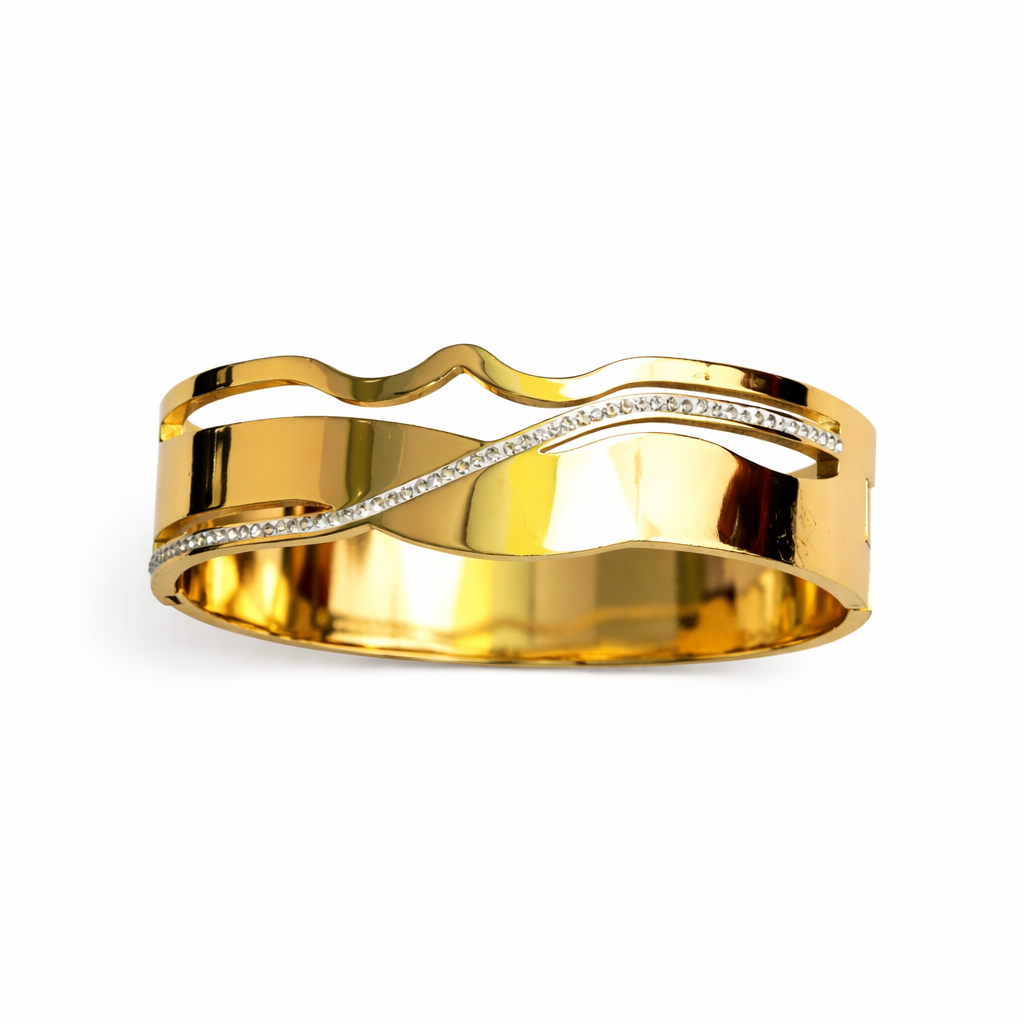 The **Golden Wave Diamond Bracelet** features a sleek gold finish highlighted by elegant wave patterns that symbolize flow and sophistication. Accented with a row of sparkling stones, this bracelet adds a refined touch of luxury without being overpowering. Designed for comfort and durability, it is ideal for both daily wear and special occasions. Its contemporary yet timeless style pairs beautifully with ethnic and western outfits, making it a perfect gifting choice and a graceful addition to any jewelry collection.