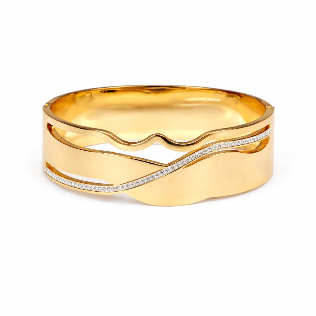 Enhance your everyday elegance with this beautifully crafted gold bracelet featuring a smooth wave-inspired design accented with delicate stones. The flowing curves and high-polish finish create a refined, contemporary look that adds subtle sparkle to any outfit. Designed for comfort and durability, this bracelet is perfect for daily wear as well as festive and special occasions. Its minimalist yet stylish appeal complements both traditional and western ensembles, making it a versatile accessory and a thoughtful gift for someone special.