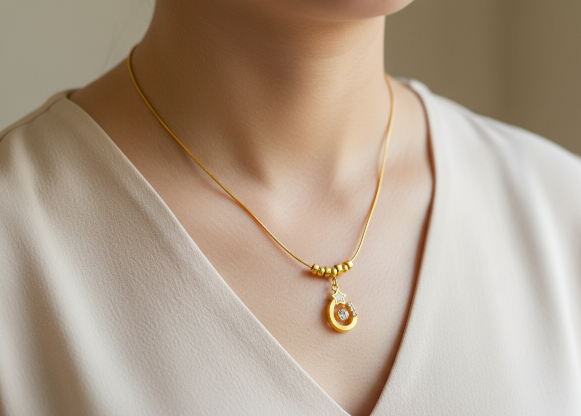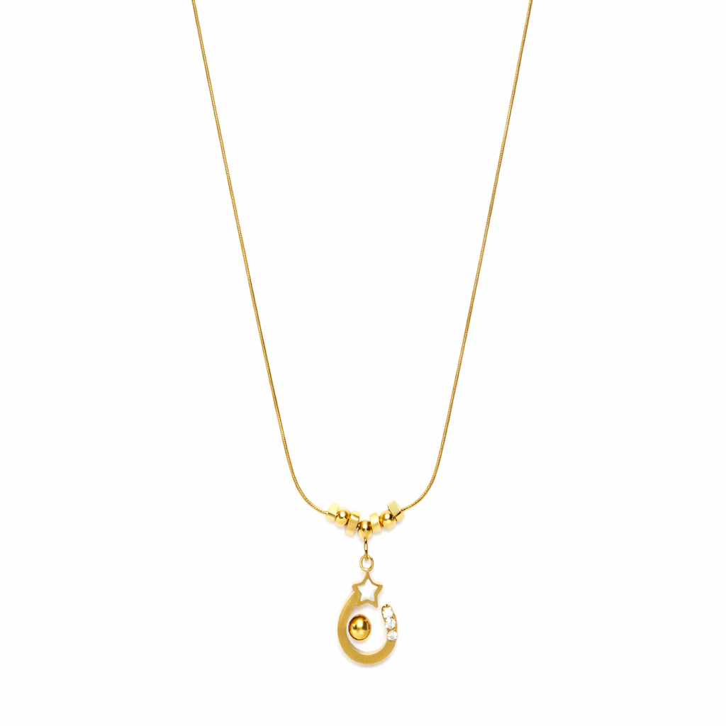 Add a touch of cosmic charm to your style with the Celestial Star Crescent Gold Necklace. This elegant design features a smooth crescent-shaped pendant adorned with a delicate star motif and subtle crystal accents for a soft sparkle. Polished gold beads along the chain enhance its modern yet graceful appeal. Lightweight and eye-catching, this necklace is perfect for everyday wear or special occasions, making it a beautiful symbol of dreams, hope, and elegance.