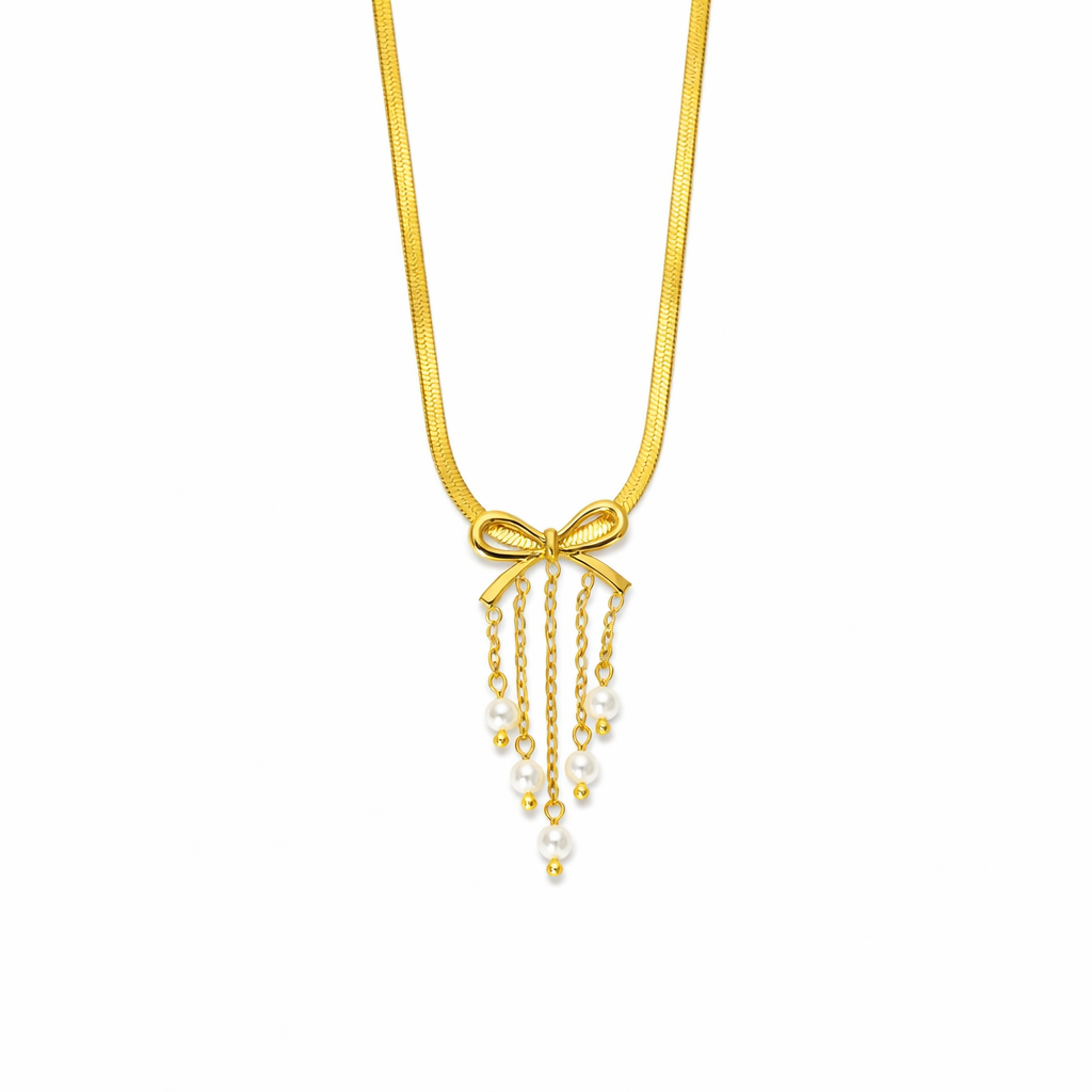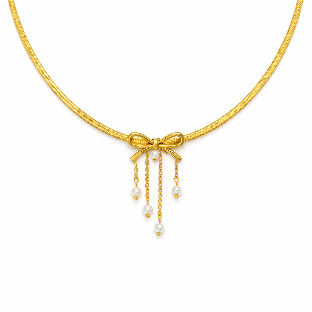 This elegant gold chain features a delicate bow-inspired design finished with graceful pearl drops that add a soft, feminine charm. Crafted to offer a refined shine, it rests beautifully on the neckline, making it perfect for both everyday elegance and special occasions. The smooth gold finish paired with gentle pearl movement creates a timeless look that complements ethnic, festive, and modern outfits. Lightweight and comfortable to wear, this chain is a subtle statement of grace, beauty, and effortless luxury.