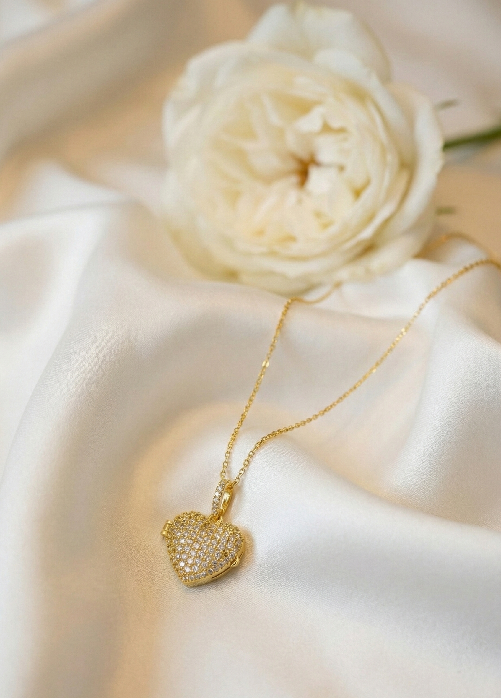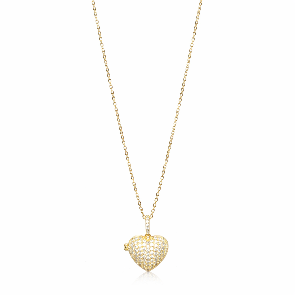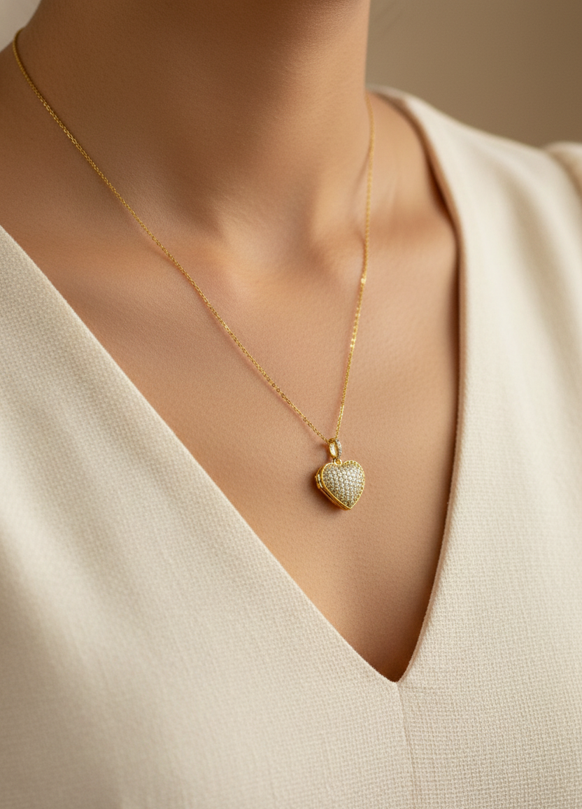 This elegant gold-tone heart pendant necklace is designed to celebrate love, style, and timeless beauty. Featuring a finely crafted heart charm adorned with shimmering stones, it adds a soft sparkle that enhances any outfit. The delicate chain sits gracefully on the neckline, making it perfect for everyday wear or special occasions. A symbol of affection and elegance, this necklace is an ideal gift for birthdays, anniversaries, or moments that deserve to be remembered forever.