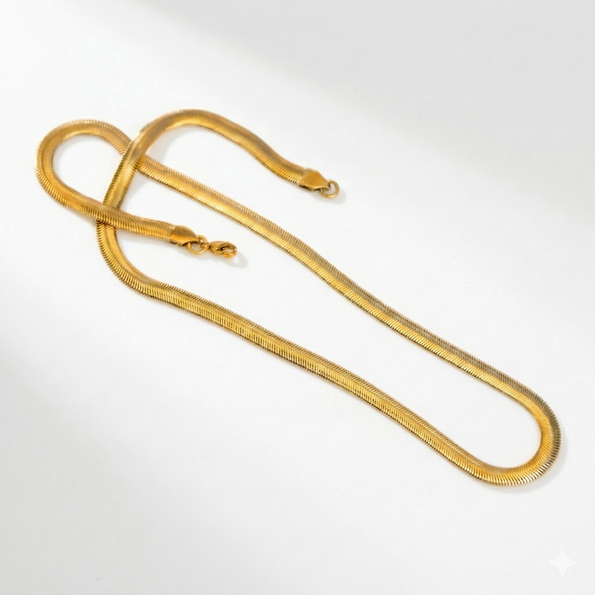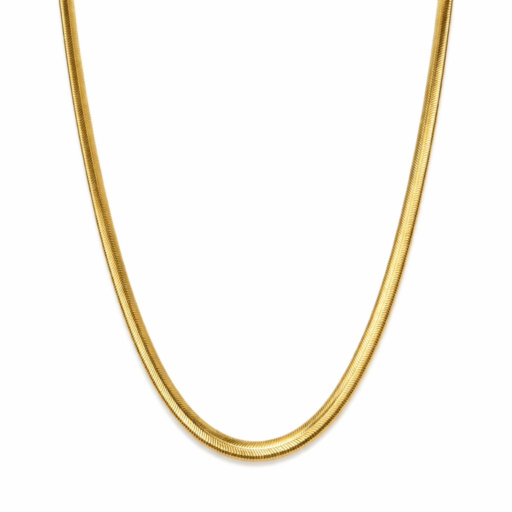 Add timeless elegance to your look with this classic herringbone gold chain designed for a smooth, fluid finish and refined shine. The flat, closely woven links create a luxurious silk-like appearance that sits gracefully on the neckline. Lightweight yet durable, this chain is perfect for everyday wear or special occasions. Style it alone for a bold, minimalist statement or pair it with pendants for added versatility. Its sophisticated design complements both traditional and modern outfits, making it a must-have piece in any jewelry collection.